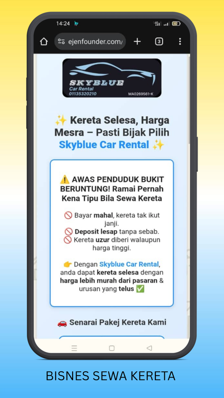 klikbisnes.com/SkyBlue_Car_RentalWebsite profesional untuk ejen hartanah. Papar senarai rumah, butiran lokasi dan nombor telefon.